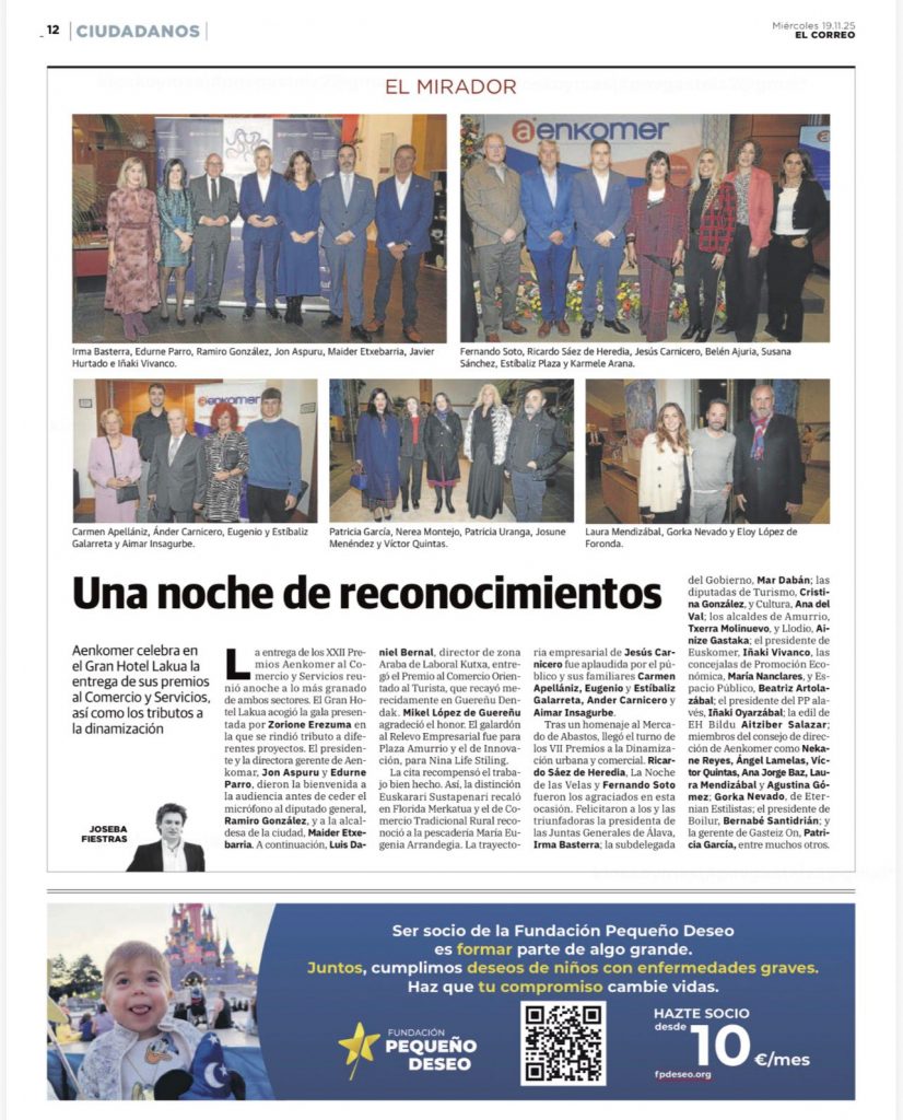 La prestigiosa revista El Correo ha publicado un reportaje sobre la gala de entrega de los Premios Aenkomer al Comercio y Servicios, celebrada en el Gran Hotel Lakua, donde se reconoció a los profesionales y empresas que impulsan el desarrollo comercial en Álava.