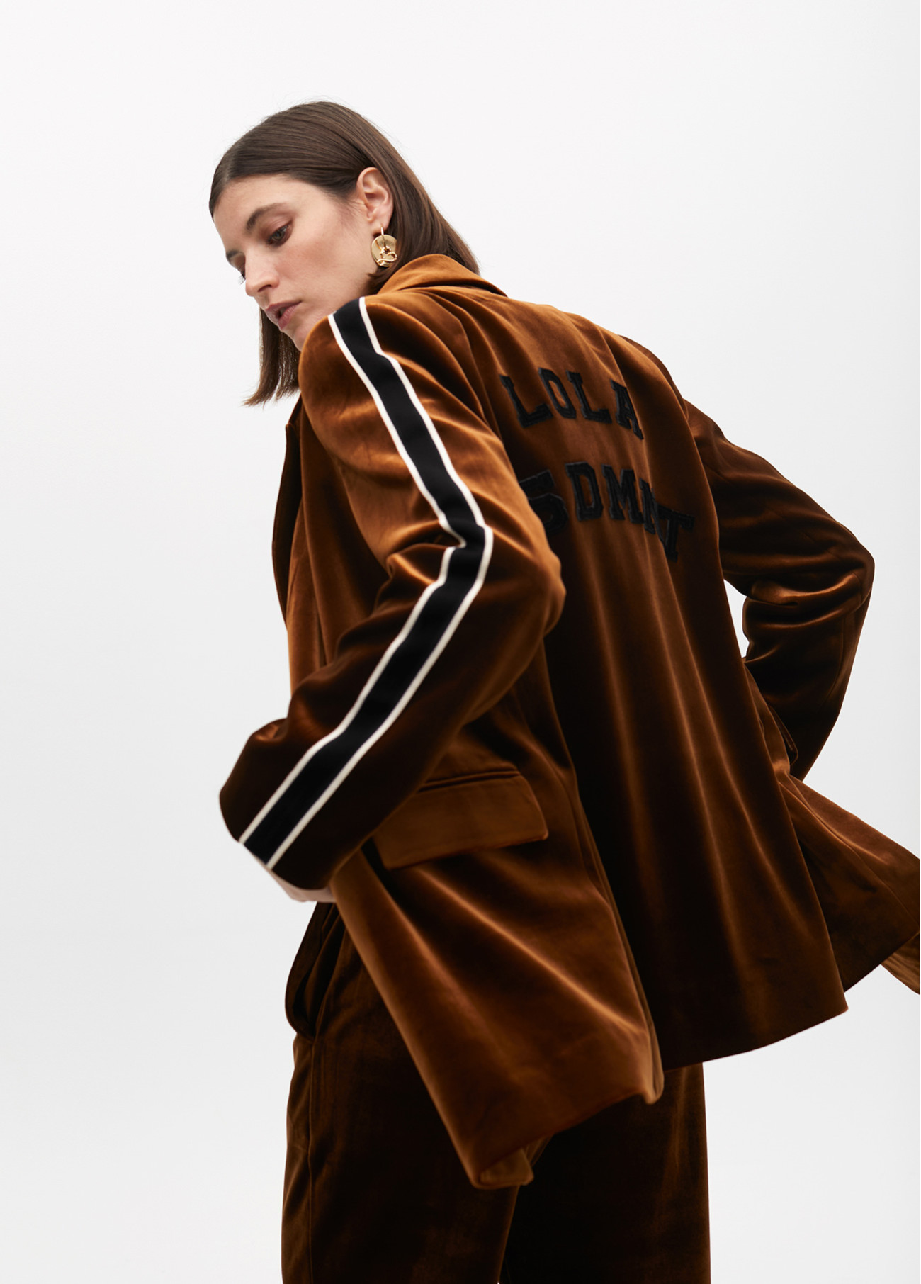 Americana de terciopelo con detalle de rayas en las mangas. Diseño de solapa clásica, cierre de botones y bolsillos frontales. Logo bordado en la espalda, ofreciendo un acabado sofisticado y distintivo.