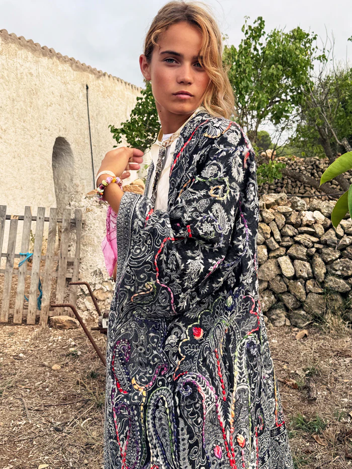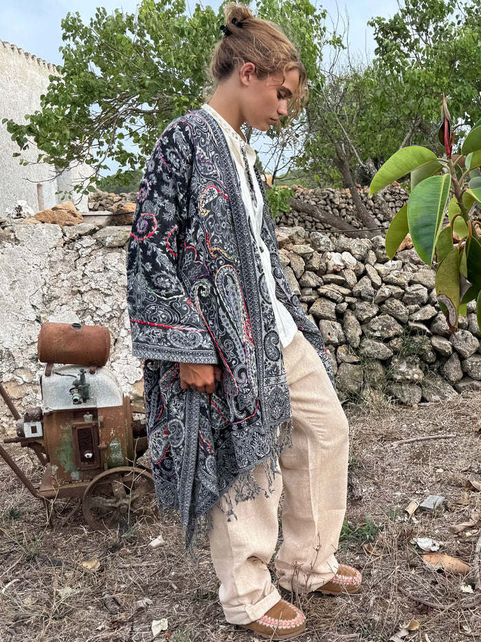 Poncho de lana natural bordado a mano. Destaca por su calidad artesanal y la auténtica esencia de las Islas Baleares. Cada pieza es única, están hechos a mano con cuidado y detalle, lo que garantiza una prenda exclusiva en tu guardarropa.