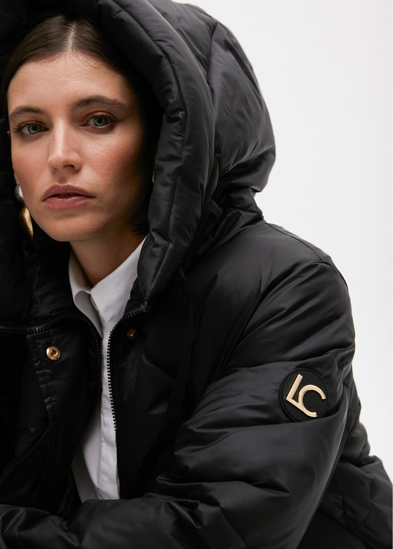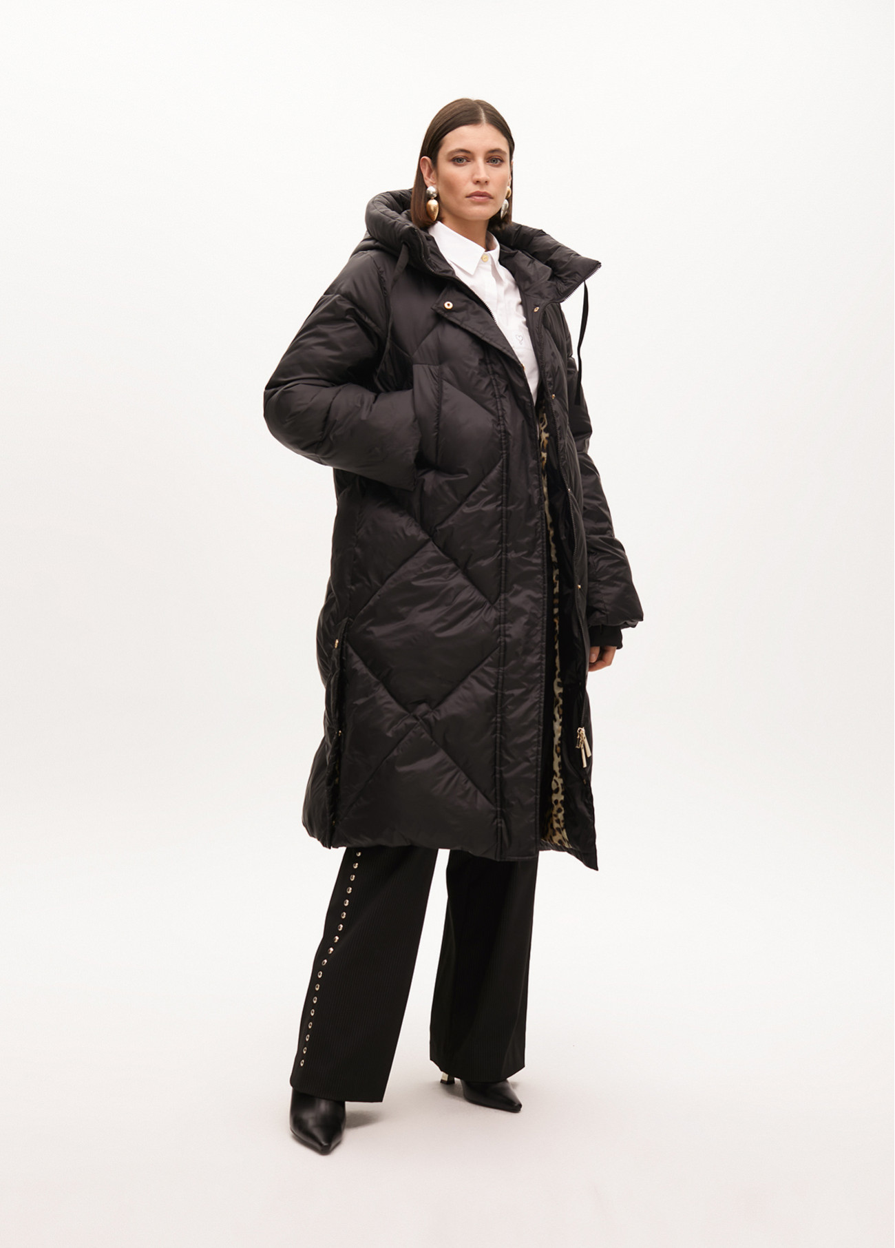 Anorak largo con relleno de plumas, capucha ajustable y cierre de cremallera completo. Interior forrado con estampado animal print. Detalles de logo en la manga y bolsillos laterales funcionales.