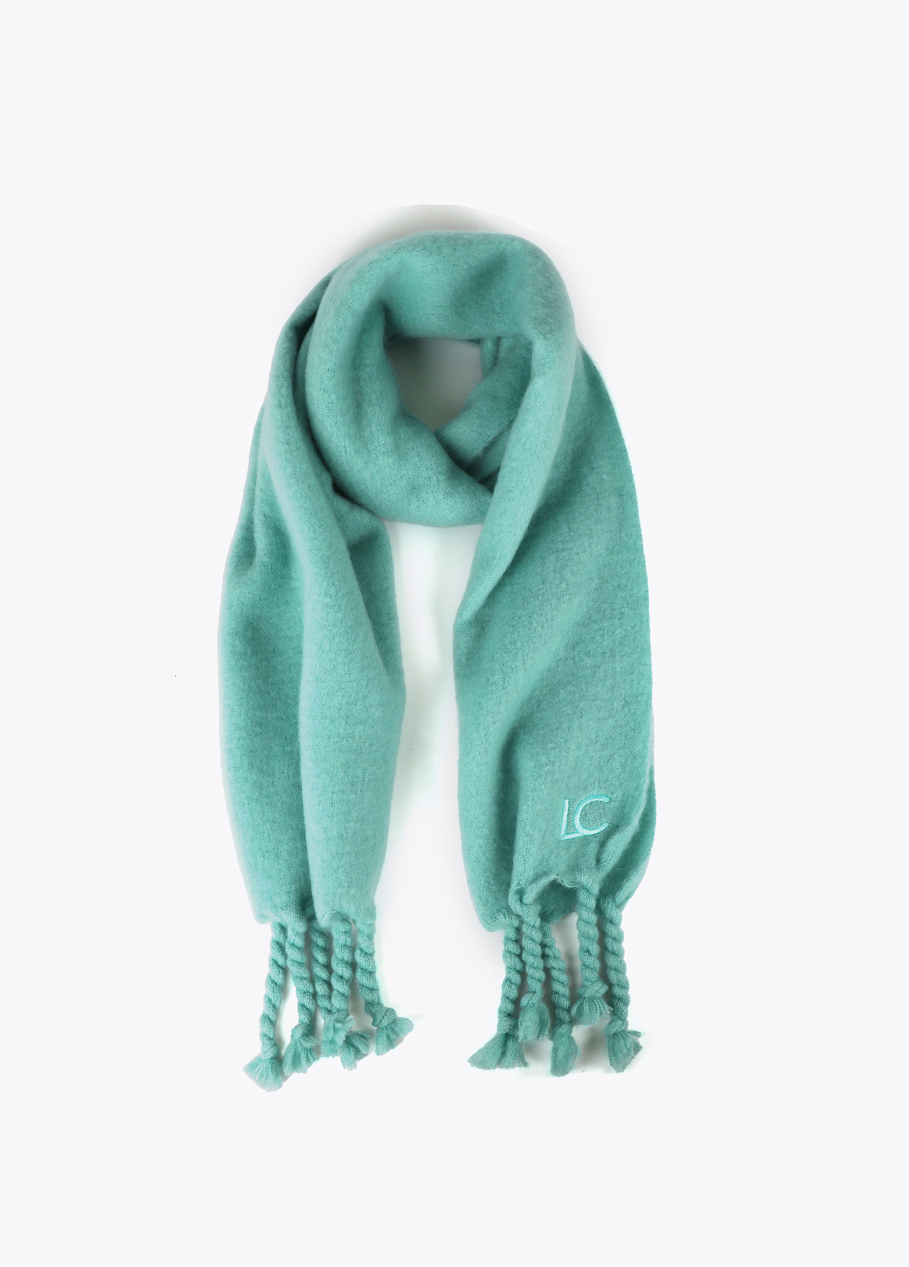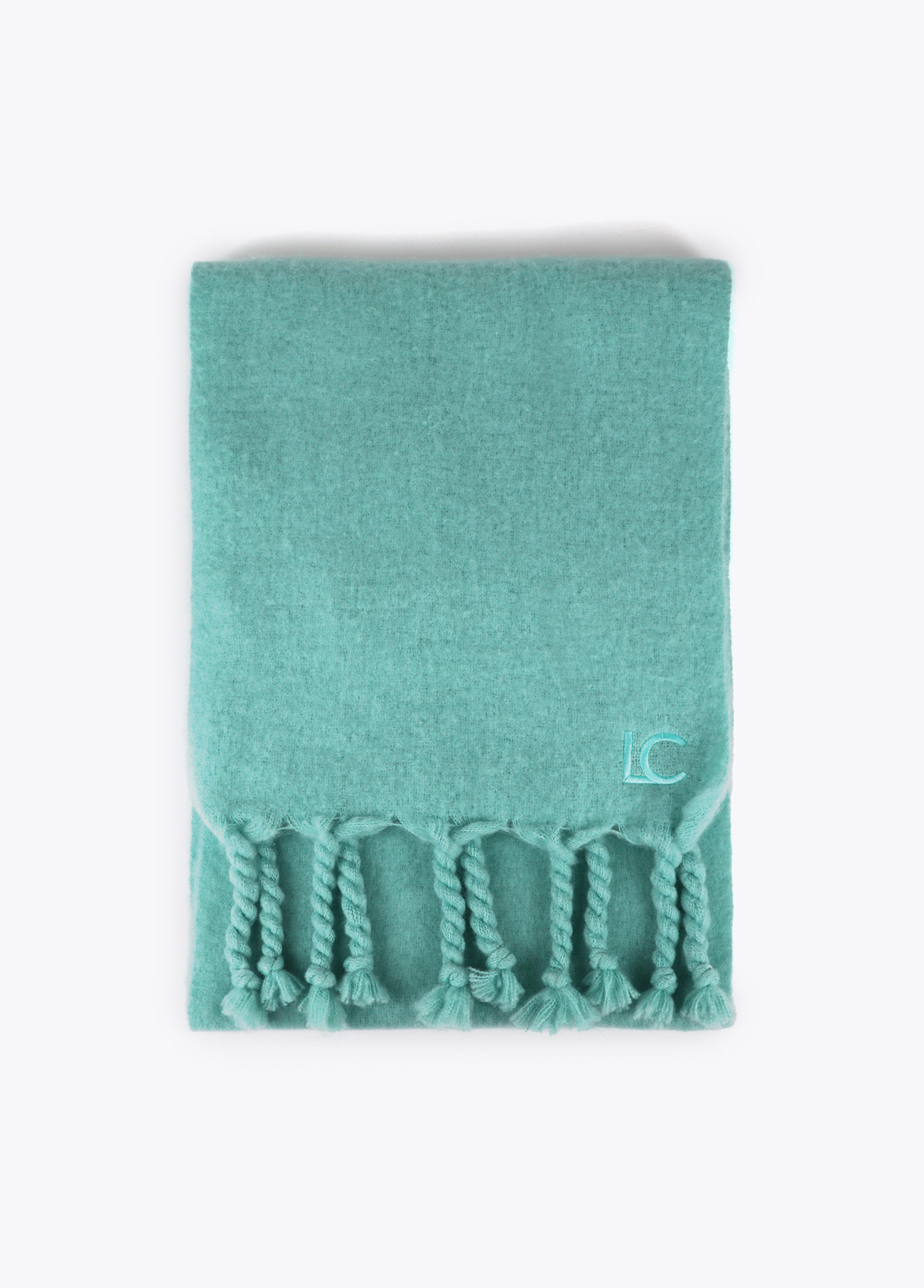 Bufanda suave de diseño liso en color turquesa. Confeccionada en tejido de alta calidad, presenta flecos gruesos en los extremos y el logo bordado. Amplia y cálida, ideal para mantener el confort durante el invierno.