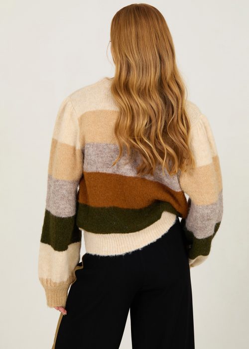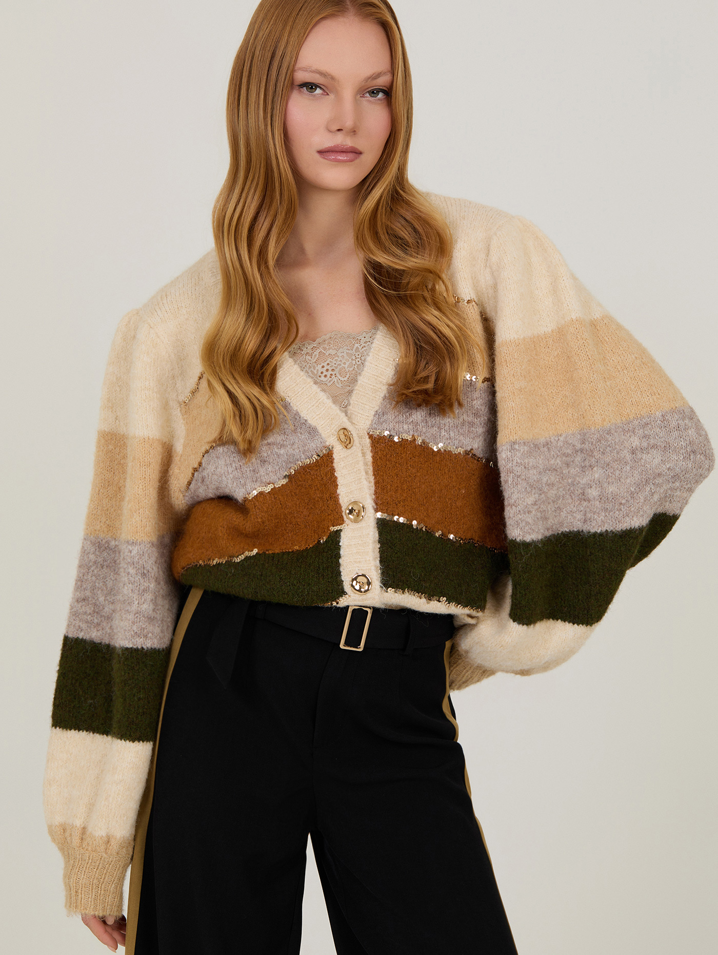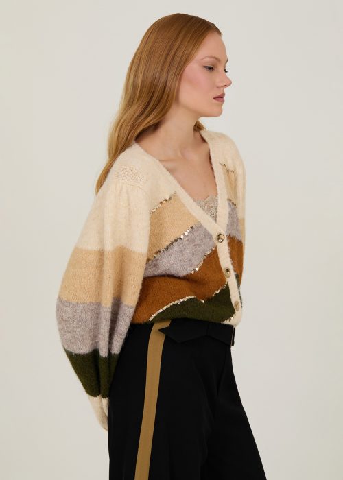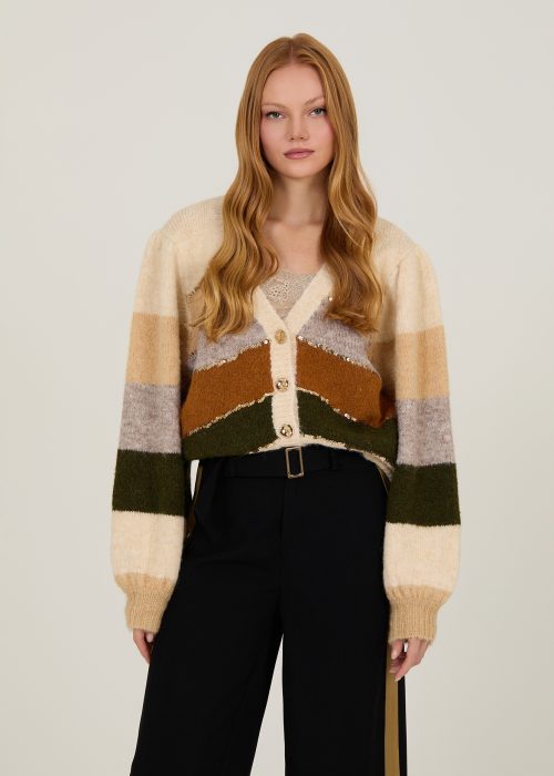 Cárdigan corto de manga larga. Con franjas multicolor y detalle de lentejuelas. Punto con lana y poliéster reciclado.