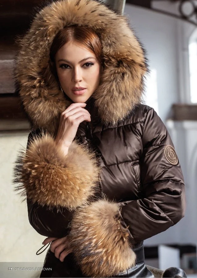 Su lujoso pelo de zorro en los puños y la capucha, y su relleno de plumas de pato y plumón crean un equilibrio entre elegancia y comodidad térmica.